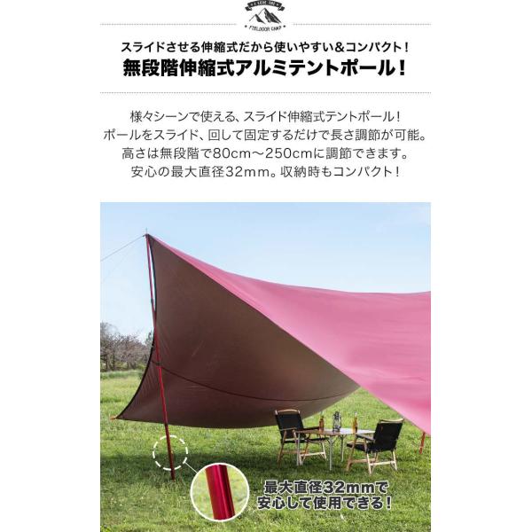 様々なシーンで使える、スライド伸縮式テントポール!ポールをスライド、回して固定するだけで長さ調節が可能。高さは無段階で80cm〜250cmに調節できます。安心の最大直径32mm。収納時もコンパクト!