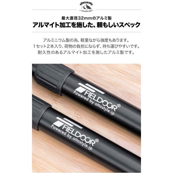 アルミニウム製の為、軽量ながら強度もあります。1セット2本入り、荷物の負担にならず、持ち運びやすいです。耐久性のあるアルマイト加工を施したアルミ製です。