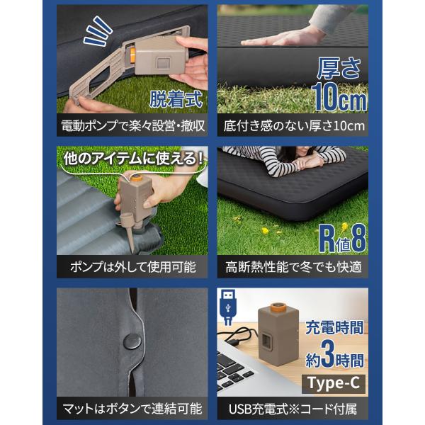 キャンプ マット シングル 極厚 エアーマット インフレータブルマット 電動ポンプ付 FIELDOOR 断熱 厚さ10cm 幅75cm×200cm 車中泊 テント 1年保証 送料無料