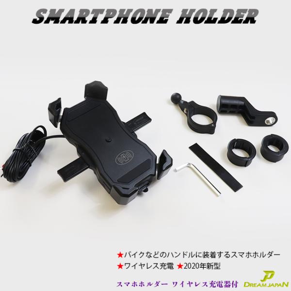 バイク スマホホルダー スマホ ホルダー スマホ充電 USBポート 置くだけ 充電 スイッチ 22mm 25mmハンドル対応 / ワイヤレス充電 / クランプバー付き