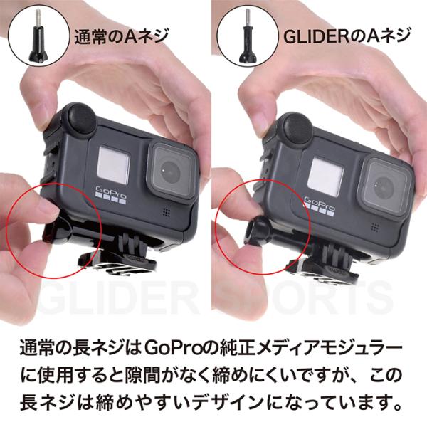 ■他社製つまみネジはGoPro純正メディアモジュラーに使用すると、ネジ部分の隙間がなく締めにくいですが、GLIDERの長ネジは締めやすいデザインになっています。