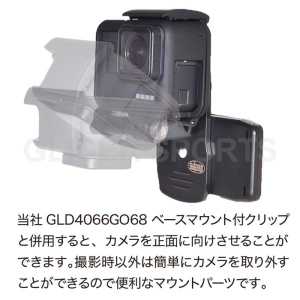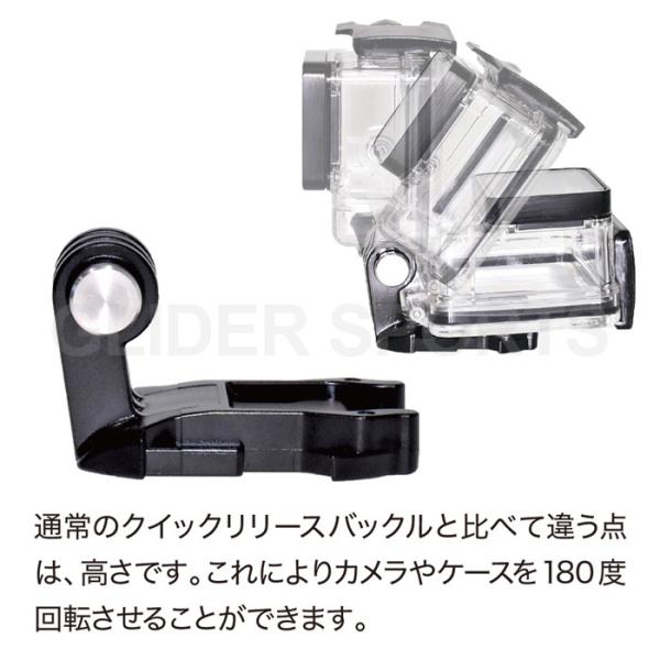 ■標準クイックリリースバックルに比べ 高い位置でのマウントが可能です。90度倒すことができるので、当社チェストマウント(GP26B)やクリップマウント その他アクセサリーでカメラが正面を向き、使い勝手が非常に良くなります(使用例イメージです。こちらの商品はL字クイックリリースバックル2個のみです)。