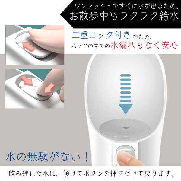 ワンプッシュですぐに水が出るため、お散歩中もラクラク給水。