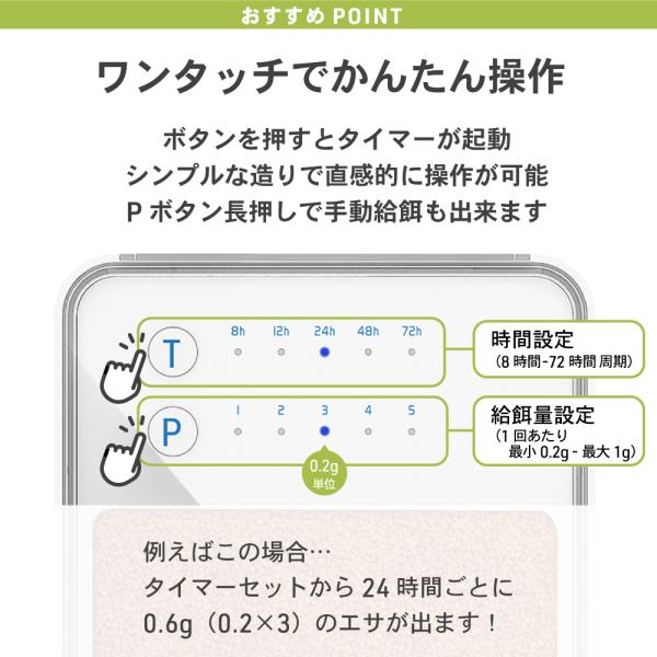 タイマーをセットしておくだけで誰でもかんたんに餌やり準備が完了。