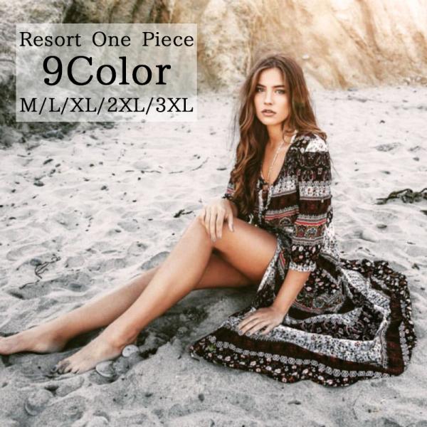 マキシ丈ワンピース ビーチワンピース リゾートワンピース ロング ワンピース フレア 五分袖 Vライン ボタン 大胆スリッド sexy 総柄 水着の上