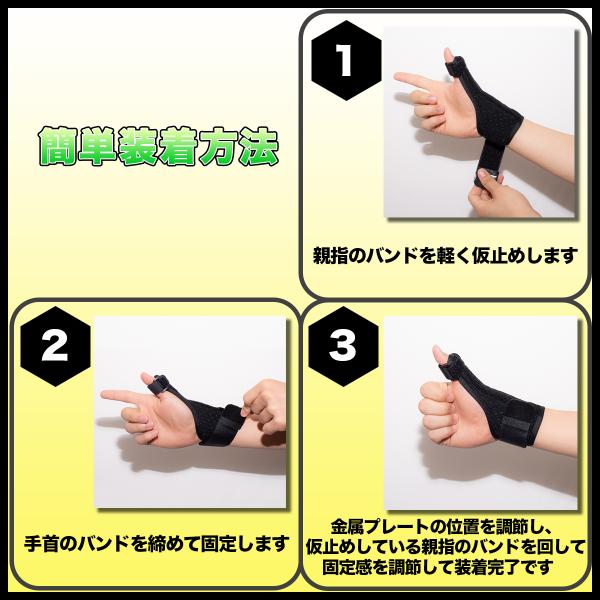 使い方は簡単。(1)親指のバンドを軽く仮止めします (2)手首のバンドを締めて固定します (3)金属プレートの位置を調節し、仮止めしている親指のバンドを回して固定感を調節して装着完了です。