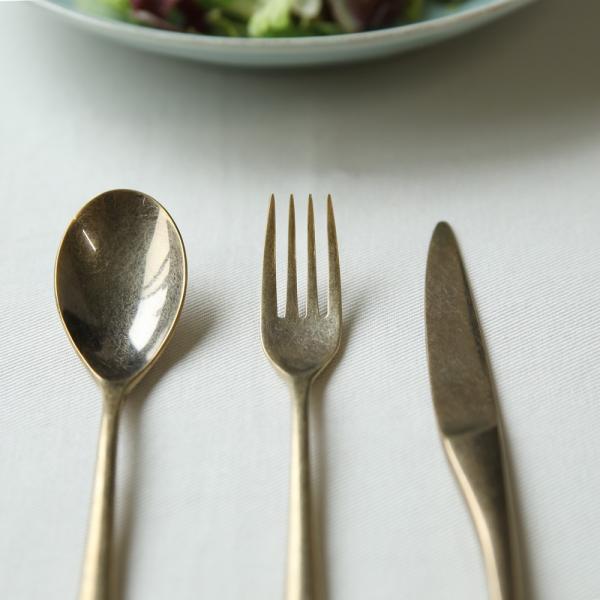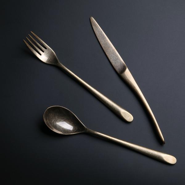 アンティークのような深みのある質感と素朴なデザインが特徴的な当店オリジナルのカトラリーシリーズ「懐」。ステンレスのベースにアンティーク風の加工と金メッキを施しました。食器や料理に重みを与えてくれて、写真映えもする味のあるカトラリーです。こちら、食事用のスプーン、フォーク、ナイフの3点ペアセットです。当店のオリジナル化粧箱に入れてお届けいたします。<br><br>関連キーワード:スプーン デザートスプーン ディナースプーン テーブルスプーン ディナーナイフ テーブルナイフ デザートナイフ テーブルフォーク ディナーフォーク デザートナイフ カトラリーセット アンティーク ヴィンテージ ダメージ 真鍮風 ゴールド 金メッキ おしゃれ かっこいい おすすめ 匙亀オリジナル 日本製 made in japan 結婚祝い プレゼント 御結婚御祝 ギフト 新生活 引っ越し祝い