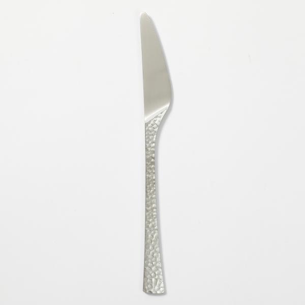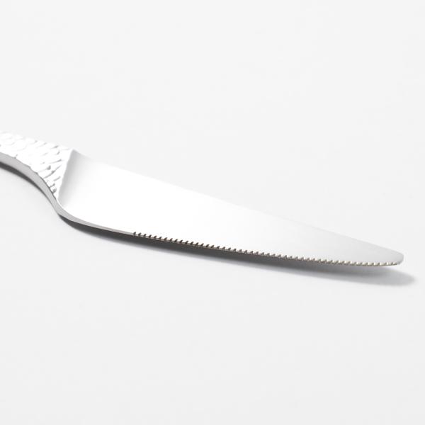 鎚目のカトラリーでも珍しく、ツボ部分にまで鎚目がつけられたディナーナイフです。全面に施された手作り感のある鎚目が暖かさと高級感を引き立ててくれて、傷も目立ちにくくなります。海外ブランドのカトラリーのように大きすぎることがなく、日本人の体のサイズに合わせたちょうどいい大きさに作られています。新潟県燕市で生産されているこちらのナイフは、持ちやすさにこだわり柄に厚みとゆるやかなカーブを持たせることで手の形にフィットするようにデザインされています。