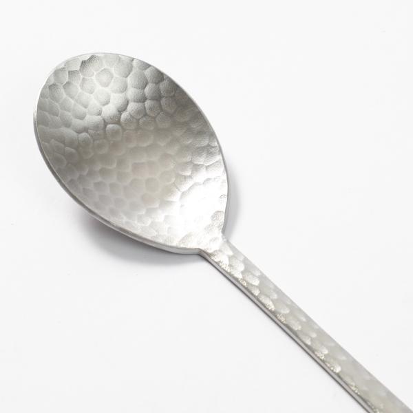 鎚目のカトラリーでも珍しく、ツボ部分にまで鎚目がつけられたロングスプーンです。全面に施された手作り感のある鎚目が暖かさと高級感を引き立ててくれて、傷も目立ちにくくなります。海外ブランドのカトラリーのように大きすぎることがなく、日本人の体のサイズに合わせたちょうどいい大きさに作られています。新潟県燕市で生産されているこちらのスプーンは、持ちやすさにこだわり柄に厚みとゆるやかなカーブを持たせることで手の形にフィットするようにデザインされています。