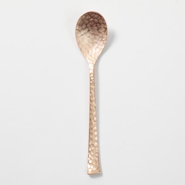 鎚目のカトラリーでも珍しくツボ部分にまで鎚目が施されたディナースプーンです。美しく輝くピンクゴールドが目を惹きます。全面に施された手作り感のある鎚目が暖かさと高級感を引き立ててくれて、傷も目立ちにくくなります。海外ブランドのカトラリーのように大きすぎることがなく、日本人の体のサイズに合わせたちょうどいい大きさに作られています。新潟県燕市で生産されているこちらのスプーンは、持ちやすさにこだわり柄に厚みとゆるやかなカーブを持たせることで手の形にフィットするようにデザインされています。