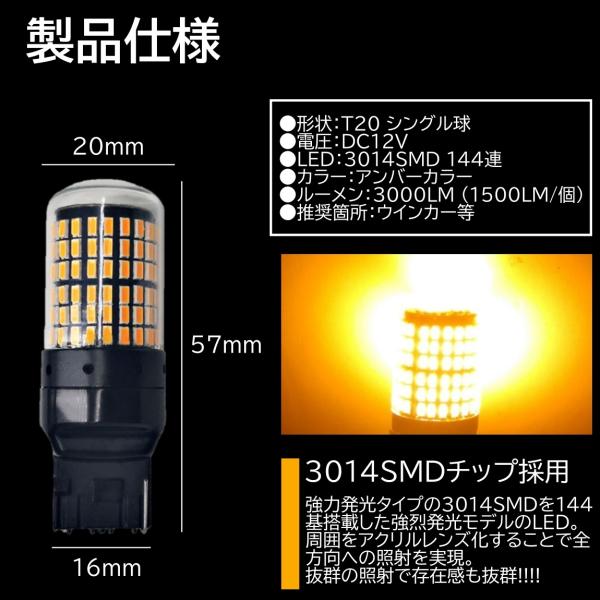 144連 爆光LED T20 S25 シングル 150度 180度 LEDウインカー アンバー ハイフラ防止抵抗内蔵 高輝度SMD ピンチ部違い対応 2個
