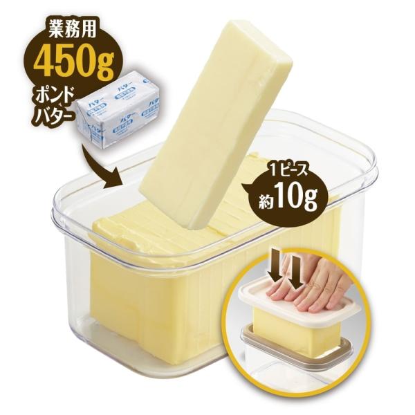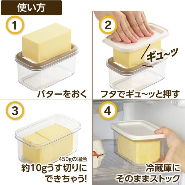 「カットできちゃうポンドバターケース」なら、ギュッと一押しで約10gにカットでき、そのまま冷蔵庫にストックできます。