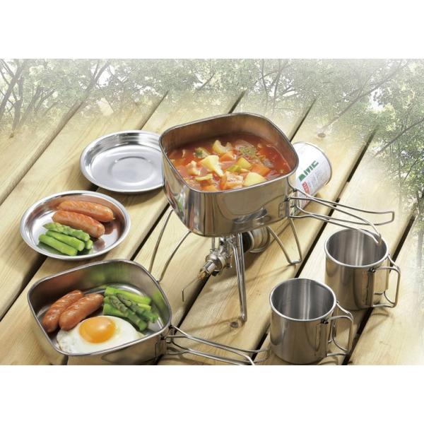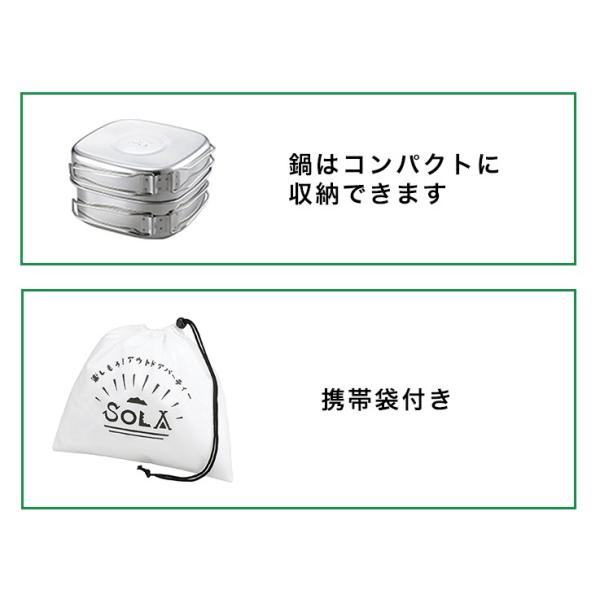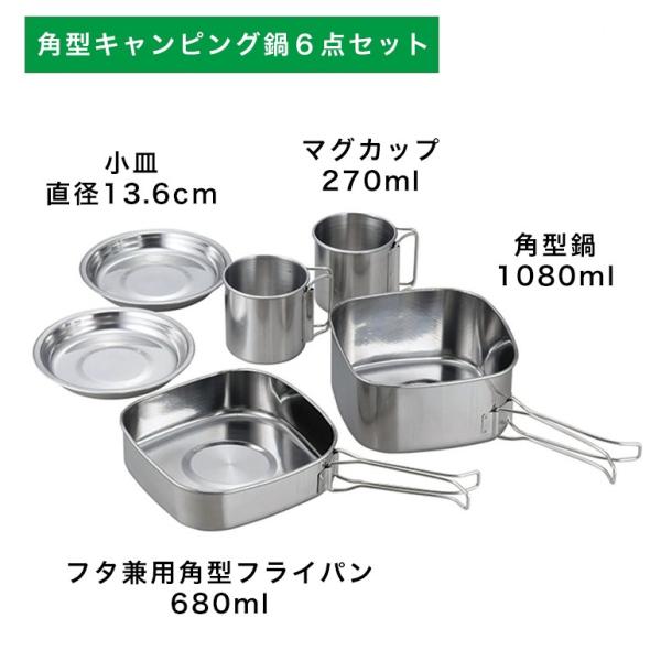 SOLA 角型キャンピング鍋 6点セット マグカップ コップ 皿 プレート 鍋 フライパン 携帯袋付き 食器 収納 ステンレス 軽い 軽量 キャンプ アウトドア