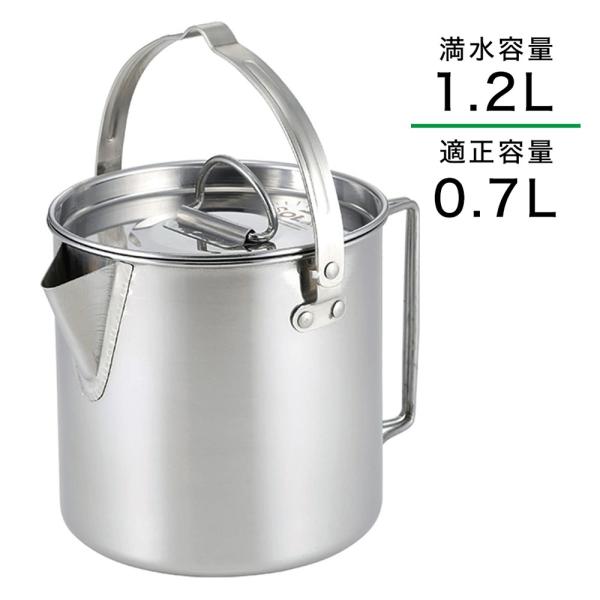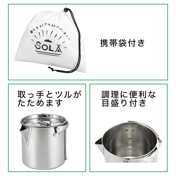 SOLA キャンピングケトル 携帯袋付き 屋外 食器 コンパクト 収納 持ち運び ステンレス キャンプ 軽い 軽量 アウトドア 非常用にも クッカー 満水1.2L 適正0.7L