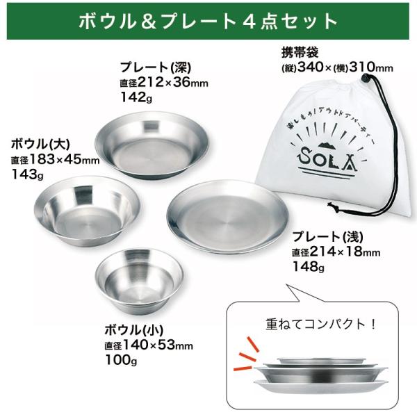SOLA ボウル&プレート4点セット PP-10 皿 セット 携帯袋付き 重ね 食器 コンパクト 収納 ステンレス 軽い 軽量 キャンプ バーベキュー BBQ アウトドア