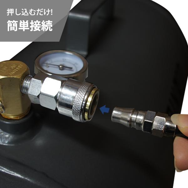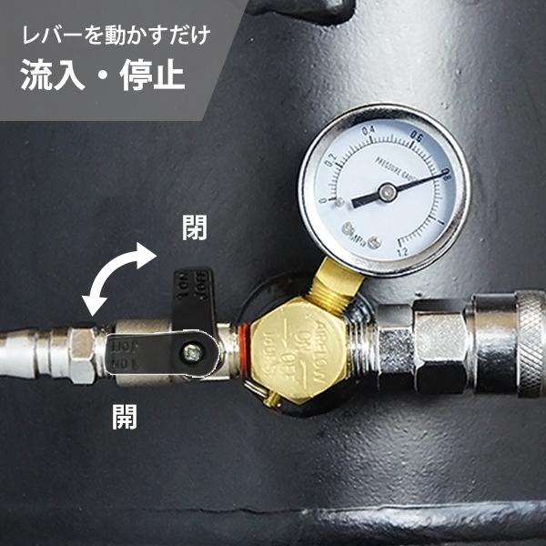 お使いのエアコンプレッサに本商品を接続することにより総容量を大きくし、効率よく安定したエアー供給が可能になります。また、キャリータンクとしてエアーを溜めた状態で持ち運びでき、1台で2役も活躍します。質量約9kgと簡単に持ち運べる重さです。