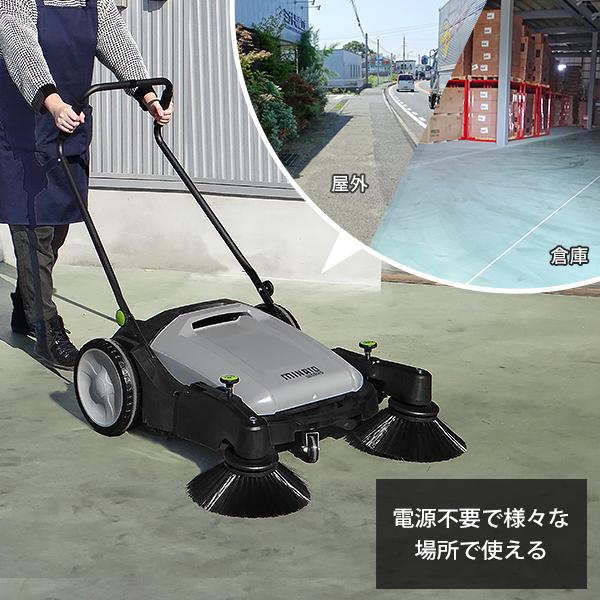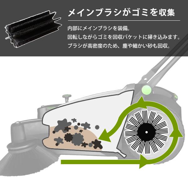 細かい塵や砂もキャッチできる、業務用のロードスイーパーです。壁際のゴミも両サイドのブラシで効率よく回収します。電源やガソリンが一切不要で、押して歩くだけで女性でも簡単に、街路や駐車場・倉庫や屋外などの広範囲の清掃が可能です。落ち葉や紙くずなどの小さなゴミも対応。集めたゴミはバケットを取り外し、手を汚さず簡単に捨てることができます。