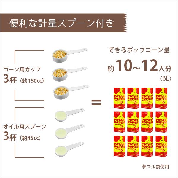 油が使えてカリっと仕上がるホットプレート式のポップコーンメーカー。専用の計量スプーン(オイル用・コーン用)が付属しているため、誰でも簡単にポップコーンが簡単に作れます。フタをひっくり返せばボウルのかわりになり、できたてのポップコーンをすぐに召し上がれます。また、別売りの『夢フル』フレーバーで味付けすることで、ご家庭でも本格的なポップコーンを楽しめます。