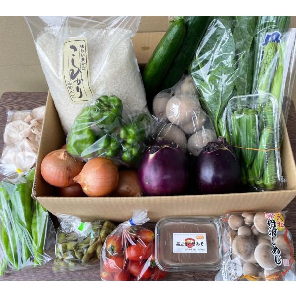 丹波産こしひかり2kg・丹波産たまご6ケ・丹波産無添加手づくり味噌300g・丹波高原ネギをはじめ旬の野菜類を5〜10種類の詰め合わせセットです。
