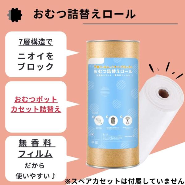 例:おむつの空のカートリッジやスペアカセットにフィルムを詰め替えることで補充が可能です。(スペアカセットは商品には含まれていません)
