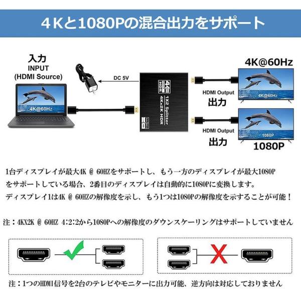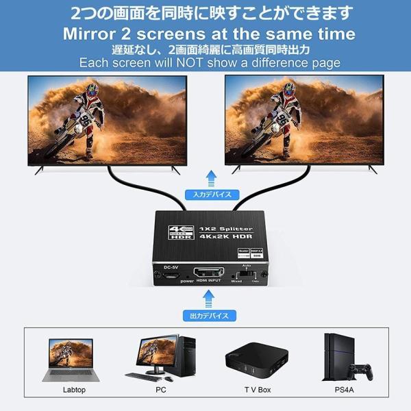 HDMI 分配器 スプリッター 4K@60Hz 1入力2出力 2画面 同時出力 アルミニウム 同じ画像の複製/ミラー、Xbox、PS5、Roku