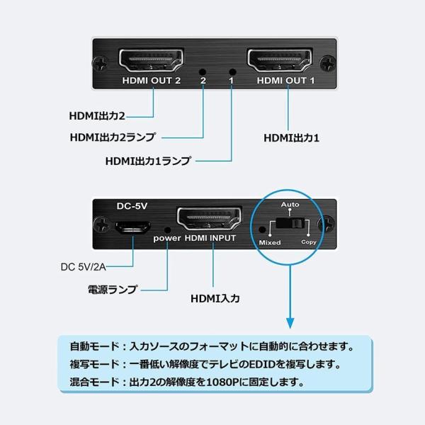 【HDMI分配器1入力2出力】HDMI2.0bスプリッター1入力2出力は、1つのHDMI信号ソースを接続して、2つの異なるHDMITVまたはモニターで同時に再生します。印象的で高解像度のビデオとオーディオを転送し、ラグ、フラッシュ、解像度の低下はありません((ミラーモードのみ、拡張はサポートされていません)。