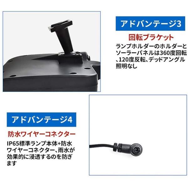 【分離式のソーラーパネル】従来のソーラーランプと比較して、ソーラーパネルをランプ本体から分離しています。付属の5m/16.5ft防水ケーブルを使用して、日当たりの良い場所にソーラーパネルを設置できます。日中は電力を節約し、夜は長くて明るい光を生成します。