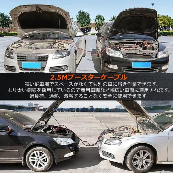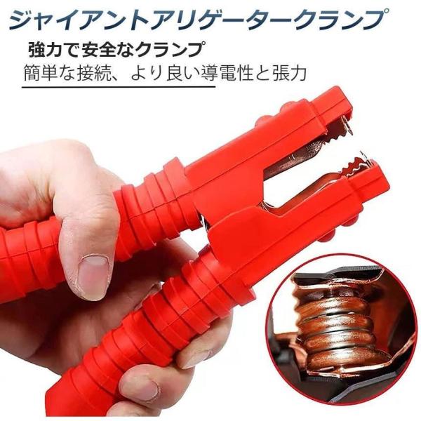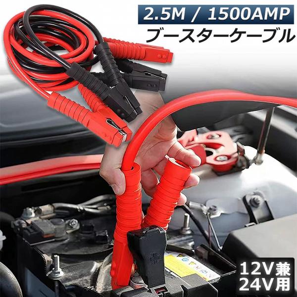 【幅広い対応性】2.5メートル長い1500AMPのケーブル、芯線直経が太く、12V/24V軽自動車商用車までに対応できます。<br><br>【PVC素材】新PVC素材のパワーブースターケーブルとしっかりとした接続のための強力なグリップの純粋な銅の歯。絶縁素材は、耐寒性と耐熱性を保証します。寒さや暑さに関係なく、腐食するのは簡単ではありません。<br><br>【耐久性&防?防寒】被覆の耐熱や紫外線劣化などの耐久性が抜群なポリ塩化ビニルを採用し、使わないまま長く置いても劣化することはない。いざという時に役に立つ。<br><br>【絶縁カバー付き】絶縁カバー付きグリップと、芯線が太いので大きな融通性をもち、発熱しないことでより安全作業。<br><br>【リスクを軽減する】緊急ブースターケーブルは色によって区別することができ、赤はプラス、黒はマイナスです。偶発的なショートのリスクを効果的に最小限に抑えます。これは自動車の緊急充電に最適です。<br>