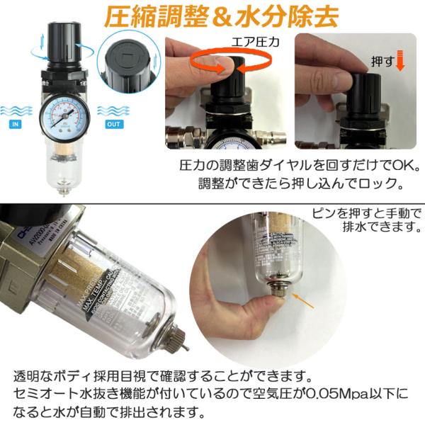【圧力調整】メータ上の黒いツマミを上げて回し、圧力を調整できます。エア圧力調整範囲:0.05-0.85Mpa