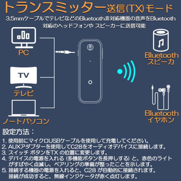Bluetooth レシーバー トランスミッター ブルートゥース 1台2役 接続 テレビ 車 パソコン PC イヤホン カーステレオ AUX 送