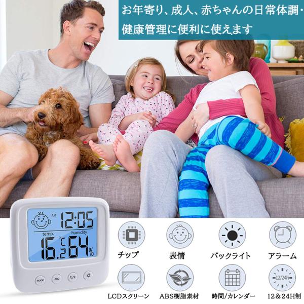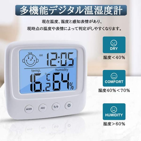 デジタル 温度計 湿度計 温湿度計 小型 コンパクト 多機能 時計機能 バックライト付き 大画面 見やすい 表情表示 アラーム付 時計 目覚まし