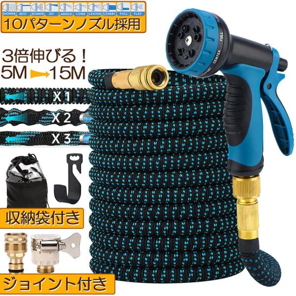 ホース 散水ホース ホースリール 伸縮ホース 伸びるホース 洗車ホース 15M 3倍に伸びる 10パターンノズル 超軽量 伸びるホースノズル 散