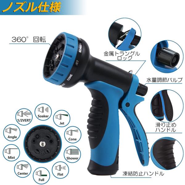 【幅広く使えます】:散水ノズルは10パターンの散水機能を搭載し、マンションや一戸建てのご使用に適しています。庭、ベランダやマンションの掃除、植物への水まき、お子様のプールへの給水、洗車などに幅広く使えます。