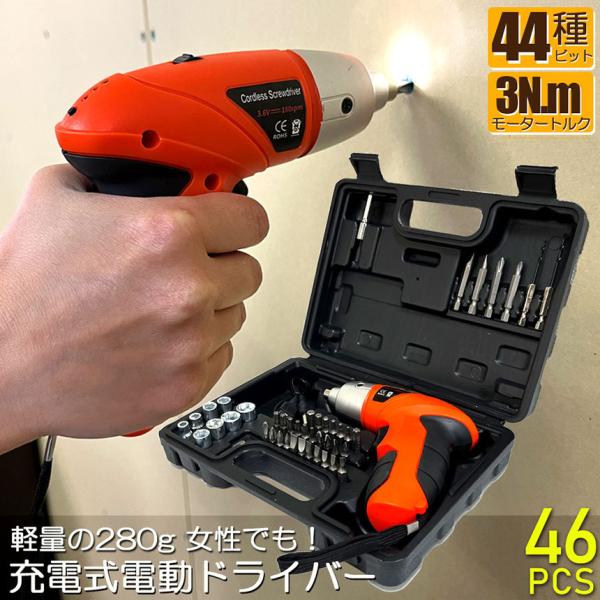 爆買 電動ドライバー 充電式ドリルドライバ セット 電動ドリル 充電式 46点セット 44種 ビット 1300mAh容量 正逆転切り替え コー