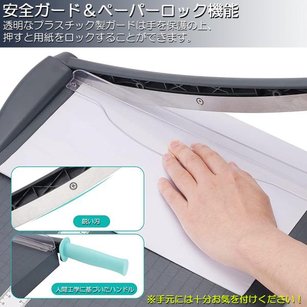【安全な操作】保護用の透明なガードは、鋭い刃から指を保護し、用紙のロック機能も備えています、様々なサイズの用紙をしっかり固定でき、ズレずにカットします。※本製品サビ防止などのため、オイルがついております。ご使用前に、手元注意しながら刃&本体のオイルを拭き取って下さい。※ご使用するするとき手元は十分お気を付けください。
