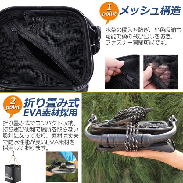 【便利なメッシュカバー】ファスナー付きメッシュ蓋つきで魚が逃げることも無く、簡単に水替えでき、そのまま海中へ沈めておくことも可能です。また、5メートルのロープ付き水辺まで距離がある場所でも簡単に水汲みができます。
