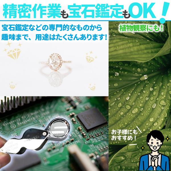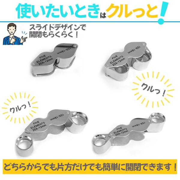 【小さくても高倍率!10倍&20倍のデュアルレンズジュエリールーペ!】ルーペはスライド式でクルっと簡単開閉!小さなケースに小さなボディー、だけどしっかり高倍率で高耐久で優れもの♪【高級感がありコンパクト!】高機能ながらコンパクトで持ち運びやすいです。胸ポケットや小さいバッグに入れたり、ミニチュアのように見た目はかわいくていい感じ♪【多用途で使える!】精密な作業や日常生活、動植物の観察など様々な場面で活躍します。宝石の鑑定、印刷物の校正、校閲などにも対応できます。