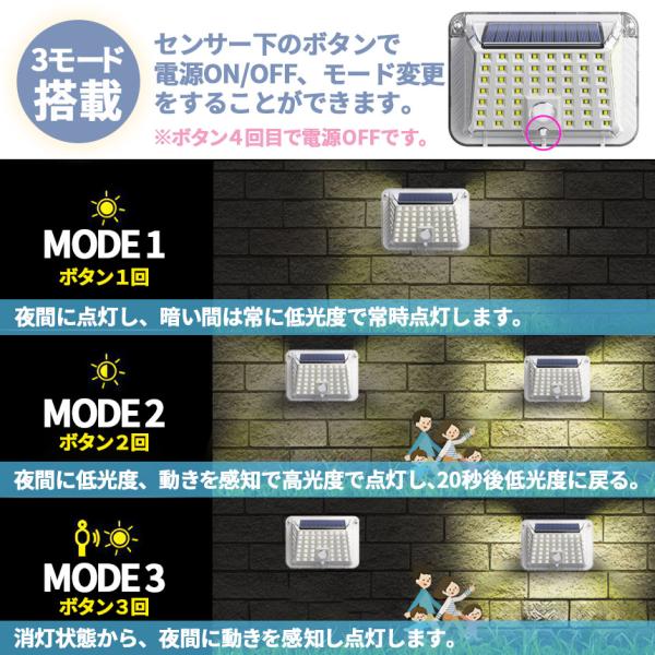 【90LEDソーラーライト】屋外ソーラーライトには90個のLEDチップが搭載しています。夜間の活動の安全性を確保するために、明るい光と、高感度センサー搭載。夜の防犯灯としてもすごく実用的です。【ソーラーセンサーライト】動体センサーと明暗センサーがあり、昼間自動的に消灯して蓄電し、夜間に自動的に点灯します。