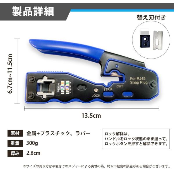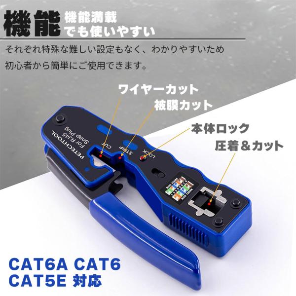 【対応コネクタ】RJ45・・・CAT5E、CAT6、CAT6A【機能】LANケーブルにコネクタを取り付けるための圧着工具です。被膜カットから圧着までこれ1台でできます。対応も幅広いので汎用性の高い仕様となっています。
