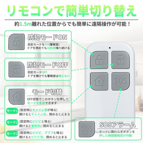●ドア・窓を開けると音が鳴る!●おうちへの不法侵入を防止する最強防犯グッズ!防犯モードをONにした状態でドアや窓が開くと大音量で警報音が鳴ります。外出時や睡眠中の防犯対策やお子様が勝手に出て行かないように守る用途でも使えます。ドアや窓以外にも、引き出しや押し入れ、たんすなど様々な場所に取り付けることができます。