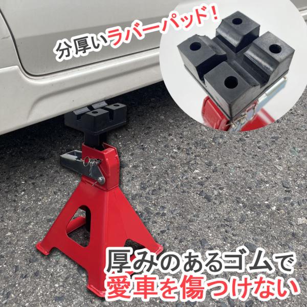【積載能力抜群】安定性抜群の4脚マット。最大耐荷重は3tで、様々な種類の車にご使用できます。※作業によって、2台もしくは4台必要となります。※全てのジャッキの高さを必ず同じになるように調整し、十分気を付けて作業してください。【丈夫で長持ちする素材】丈夫なQ235スチール製。そして、防錆コーティングを施してあるので、錆にも強く長くお使いいただけます。【高さ調節可能】6段階で高さ調整が簡単調整でき、いろんな作業に対応できます。有効使用高約280〜430mmです。また、二重ロックで、様々な車両の修理作業などで安全にご使用いただけます。【30mmのゴムパッド】厚さ30mmの極厚ゴムパッドをラチェットハンドルに使用!持ち上げ中の車体の傷を防止、車を保護しつつ作業が行えます。