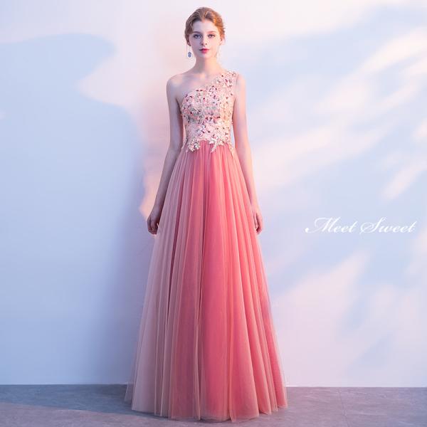 カラードレス ロングドレス ピンク ワンショルダー 演奏会ドレス パーティードレス ウェディングドレス ウエディングドレス 結婚式 二次会 披露宴 花嫁 発表会