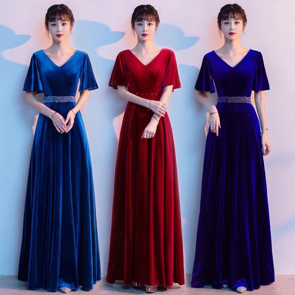 カラードレス ワインレッド ロイヤルブルー ピーコックブルー ベルスリーブ ロングドレス 演奏会 発表会 コンサート コンクール ステージドレス 大きいサイズ