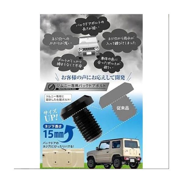 【バックドアボルトに合わせた専用設計】当社のジムニーボルトはスペアタイヤ取り外し後、タイヤレスでの孔を埋める専用の化粧ボルトです。ネジ頭下を15mmと従来商品より倍の長さに設計し、ネジ孔にしっかりハマり安心して走行できるようなジムニーボルトを作成しました。タイヤレスにされるときにぴったりな化粧ボルトです。
