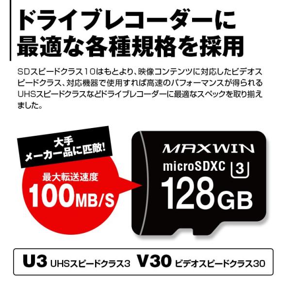 MAXWIN ドラレコ用 microSDカード 128GB マイクロ ドライブレコーダーに最適 高速モデル 最高書込み速度100MB/S Class10 SDXC フルHD録画約20時間 1年保証 マックスウィン SD-A128G