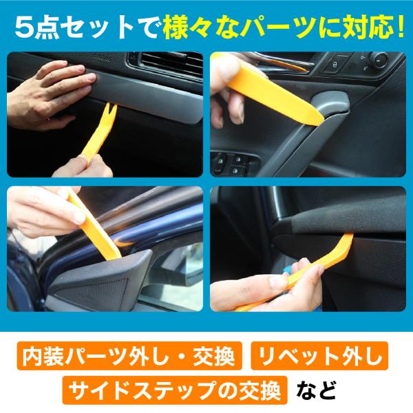 セット内容:樹脂製ツール4本(サイズ・形状違いで様々なパーツに対応)★クリップクランプツール1本(内張りを留めてあるクリップを外す専用工具)★愛車の内装を簡単取り外し 張替え 補修などにも