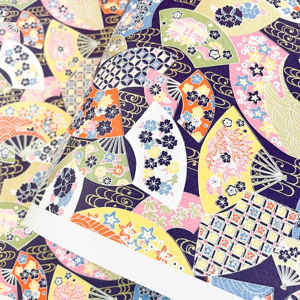 友禅和紙 華やかな花模様の扇づくし 紺 青 大判 約63x93cm 千代紙