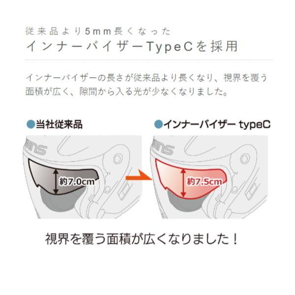 typeC(ロングインナーバイザー)仕様にチェンジし、インナーバイザーの長さが従来品より長くなり、視界を覆う面積が広く、隙間から入る光が少なくなりました。