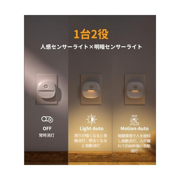 ?1台2役でコスパがいい 業界初のWセンサー式LEDセンサーライト。人感センサーライトとして使用できて、明暗センサーライトとして使うのも可能です。1台=2灯、それぞれを購入するのは不要で、ニーズに合わせてモードを楽々に切り替えます。?motion-autoモード人感センサー:周囲が暗い環境で、人が来ると人感センサーが感知して自動点灯。離れて60秒後に自動消灯。感知範囲は120°、約4メートル以内です。?light-autoモード明暗センサー:周囲が暗くなると自動的に点灯し、明るくなると自動消灯します。持続点灯する常夜灯として使え、消し忘れがなくて便利です。?OFFモード:旅行でしばらく必要がない時に便利なモード。