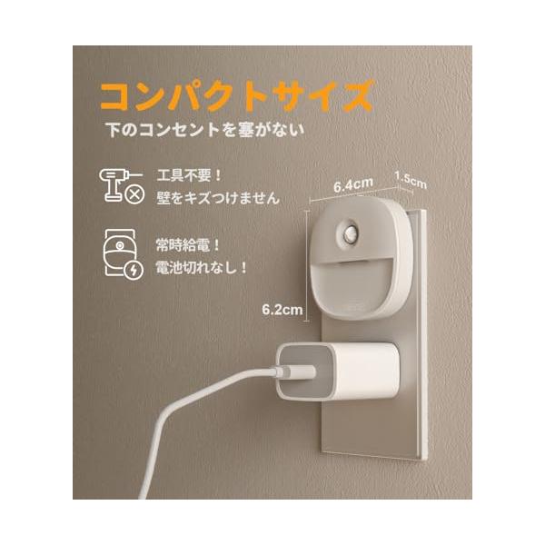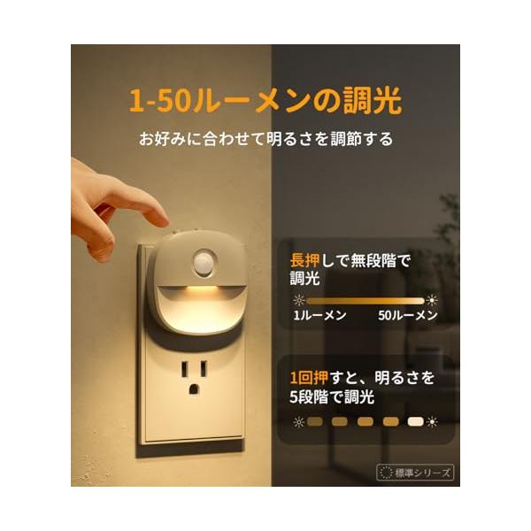 ?50ルーメンまで無段階で調光する人感センサーライトの調光ボタンを長押しすると、1ルーメンから50ルーメンまで細かく無段階に光量を調整できます。もちろん、短押しすると決まった5段階の明るさから選択することもできます。下に向きの発光、まぶしすぎない光量で、夜起きても足元をしっかり視認できて、目が冴えないです。さらに、色温度:2700K。温かい電球色で目にやさしくて、常夜灯として寝室に設置してもお年寄りと子ど